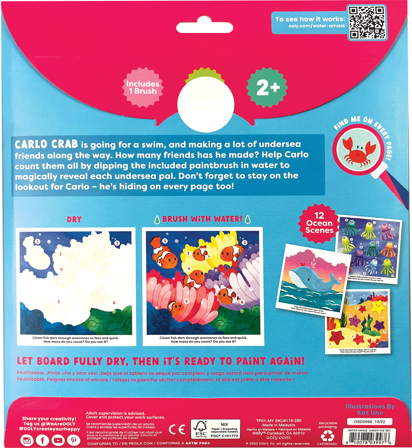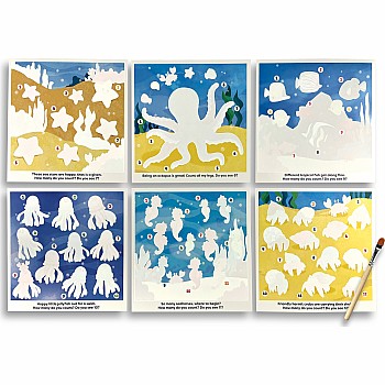 Let your kiddo make a splash - literally! This under the sea water reveal book gives your child a chance to paint with water and make a colorful ocean-themed illustration appear! This creative learning tool also exposes your child to numbers as they count their undersea friends! The 13 piece kit includes 12 reusable water reveal boards and a brush to paint with.