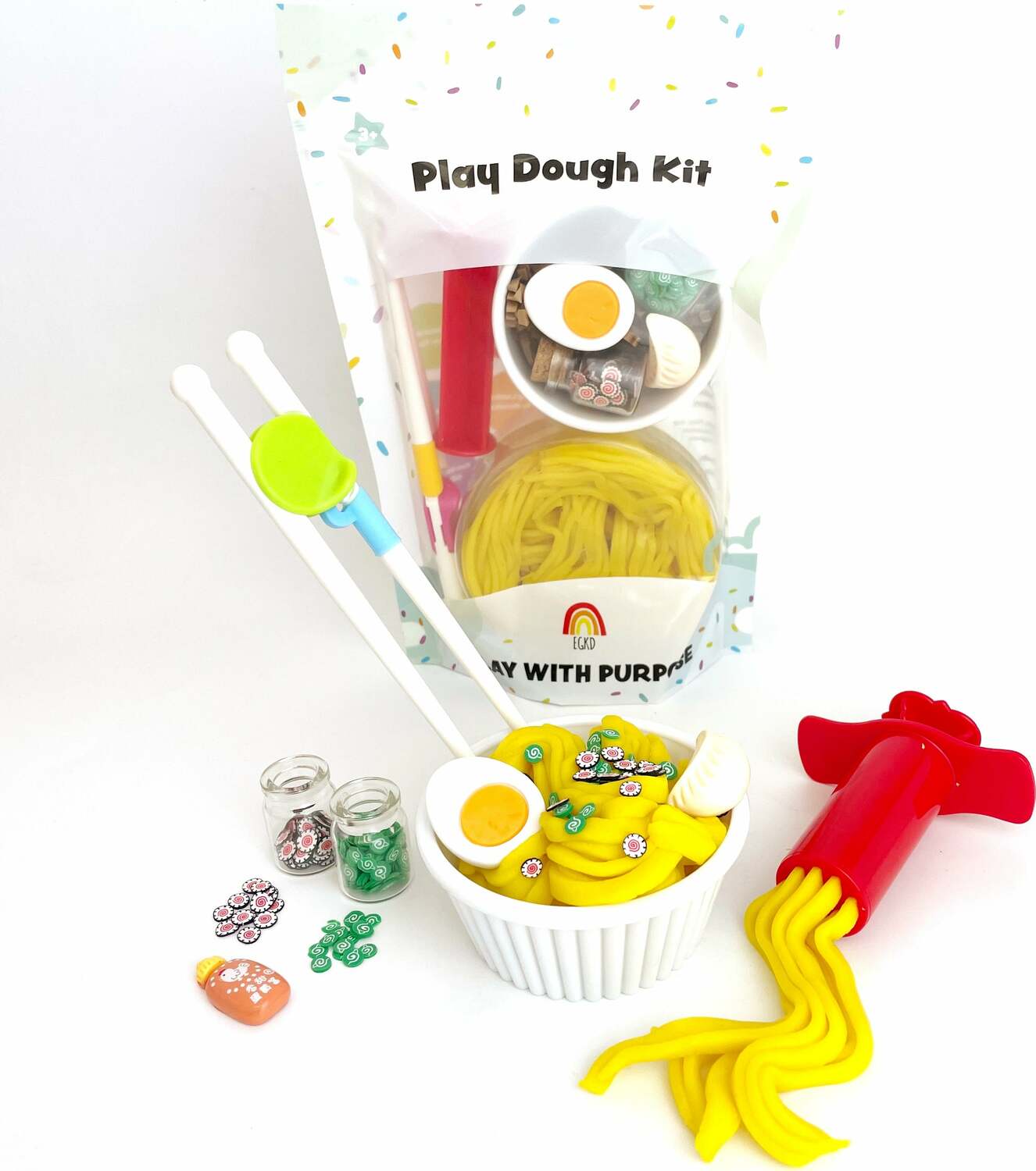 Includes 8 Ounce jar Yuzu Citrus KidDough, Melamine bowl, noodle extruder, chopsticks with chopstick trainer, dumpling charm, egg charm, chili sauce charm, green onion fimo, and fish cake fimo.