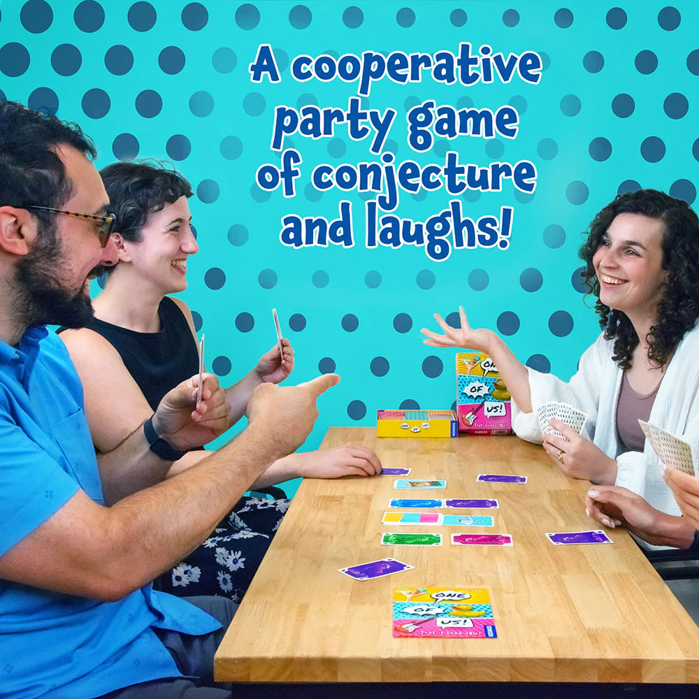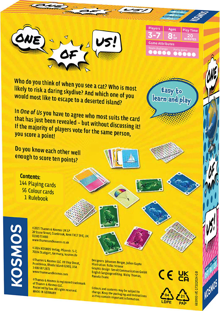 A cooperative party game of conjecture and laughs. Who do you think of when you see a cat? Who would best wear a daredevil parachute jumpsuit? And who of you would prefer to disappear to a desert island? In One of Us, you have to agree on which player you most associate with the card you’ve just turned over — and without discussing it! If the majority point to the same person you score a point. Can you manage to be on the same wavelength and score ten points?
