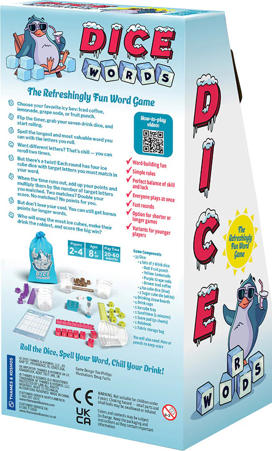Each player begins by choosing a set of seven letter dice that each represent a different iced beverage. When the timer starts counting down, players attempt to form the longest and most valuable word possible. Don’t have the letters you need? Don’t worry! You can re-roll any of your dice up to two times before the round ends. But, things are not as simple as they seem: in addition to your individual letter dice, you must also try to incorporate the most “target letters” — four ice cube-shaped letter dice that are revealed at the beginning of each round. The colder your drink, the higher your score!