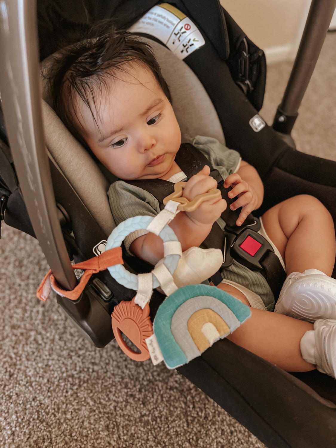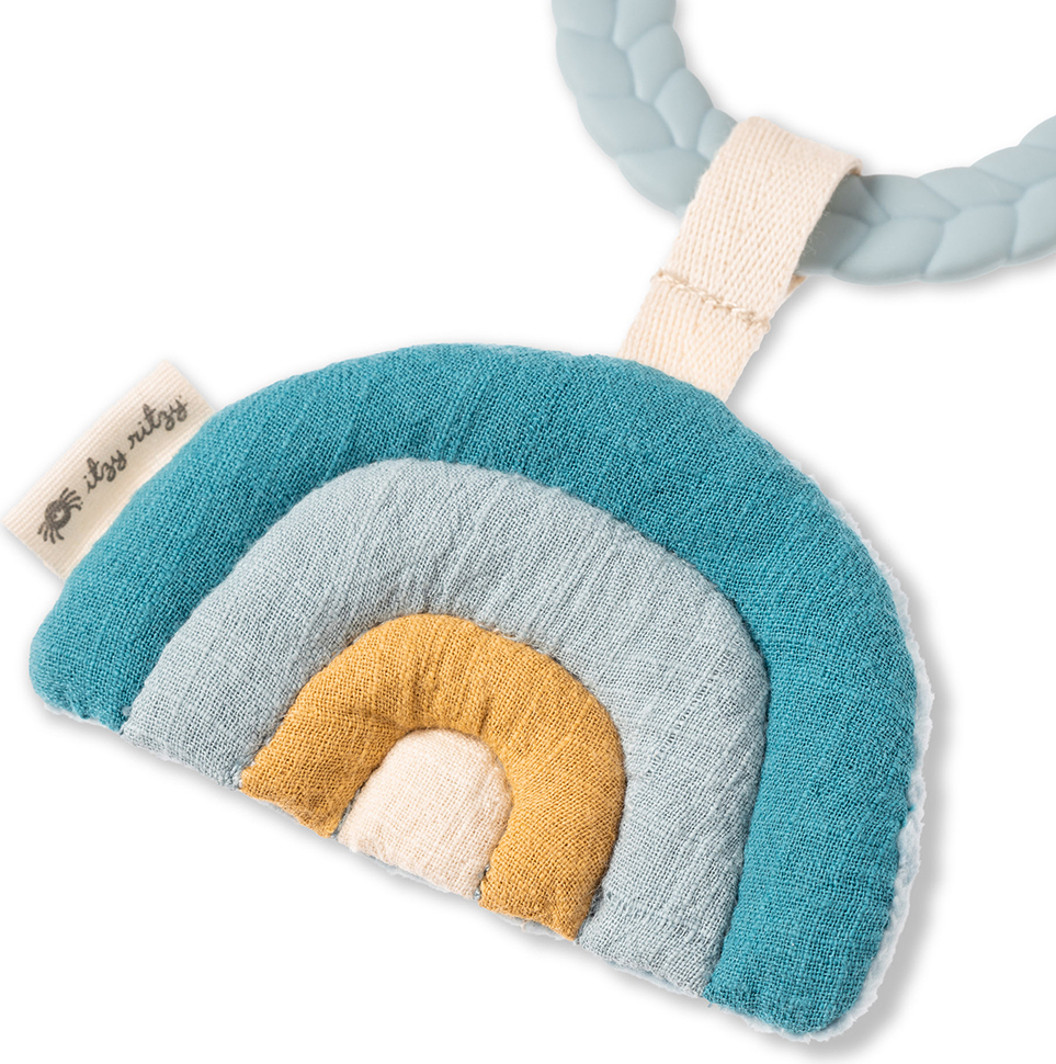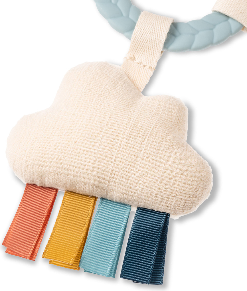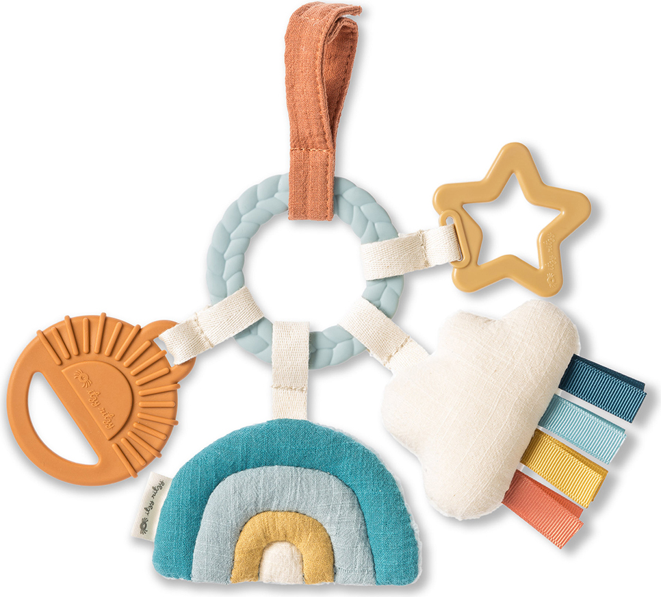 • Our signature braided teething ring is surrounded by adorable dangling toys with all different textures that keep baby busy on the go