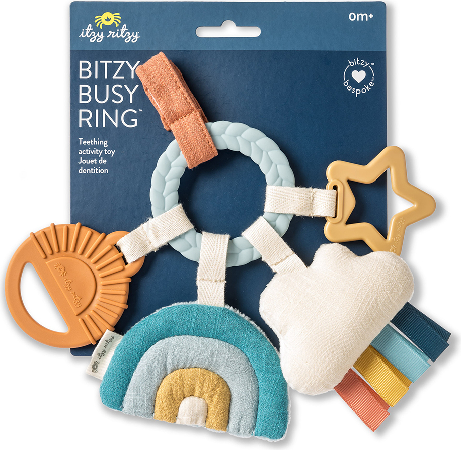 Teethe, Play & Explore! A sensory sensation, our Bitzy Busy Ring™ has all the love in the details with multiple features for baby to explore. Textured teethers and dangling toys that jingle, crinkle and delight – easily attach this toy to baby’s car seat or stroller for adventures ahead!