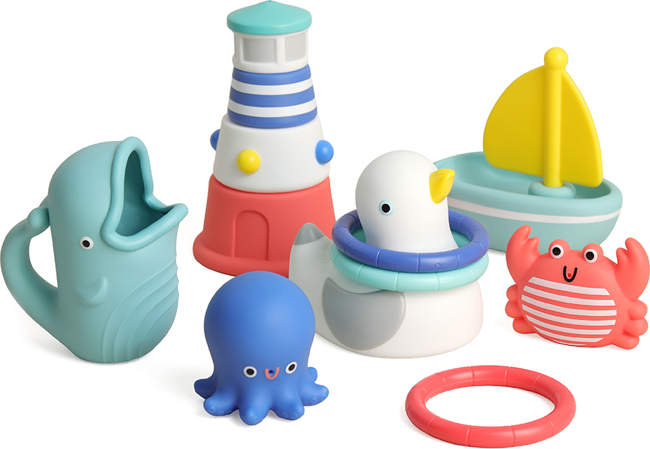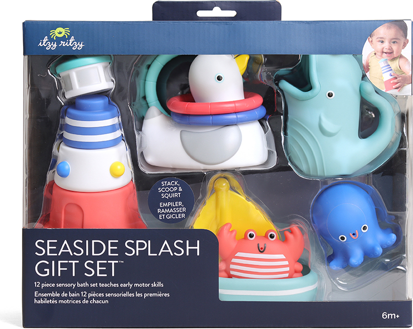Oceans of Fun! Sail through baby`s clean routine with Seaside Splash Gift Set™. Featuring 12 nautical-themed pieces, this gift-ready bath set will keep baby engaged and entertained while building early motor skills. Anchors aweigh!