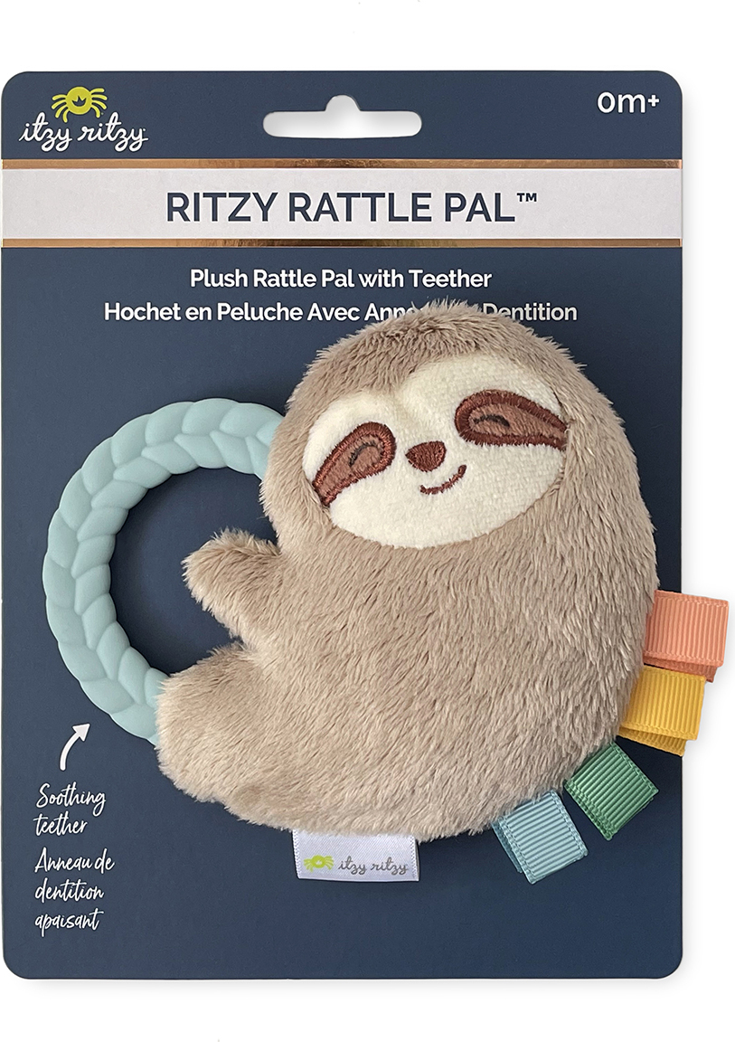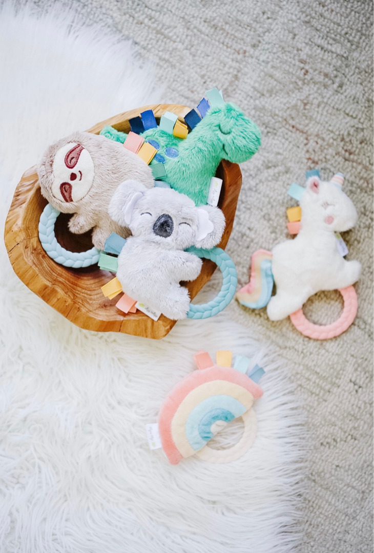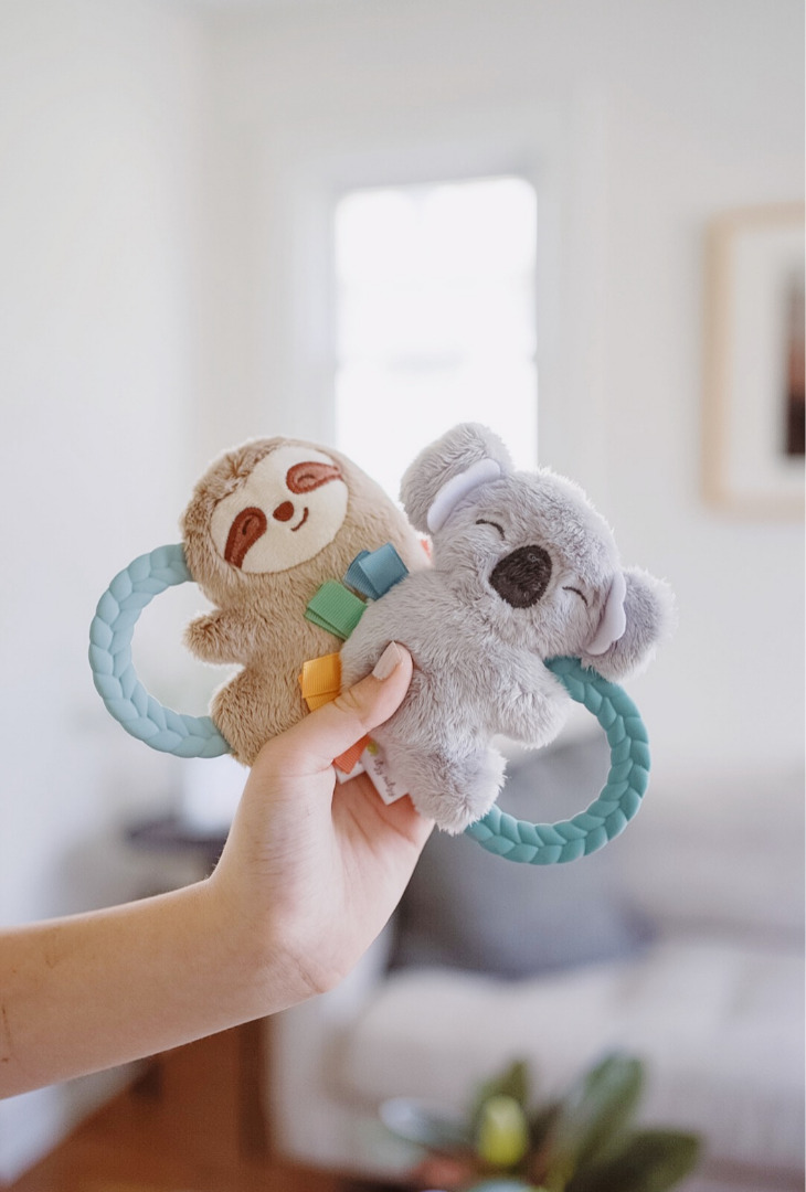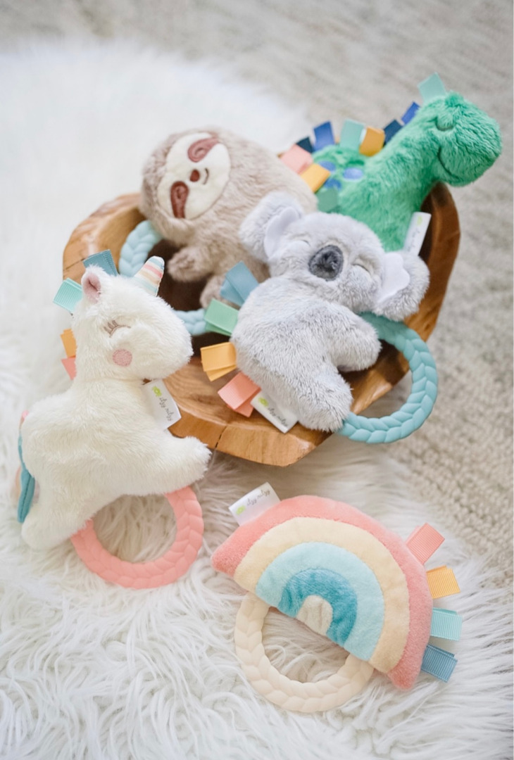 The Ritzy Rattle Pal™ is your babe's new bestie, doubling as a plush rattle and braided teething toy to soothe sore gums. With a gentle rattle sound and colorful textured ribbons, this playful baby rattle keeps your little one entertained and comforted. Whether in the stroller or car seat, the Ritzy Rattle Pal makes a perfect travel toy! Choose from a variety of stuffed animal characters, including a unicorn, dinosaur, sloth, and koala, or the adorable rainbow option.