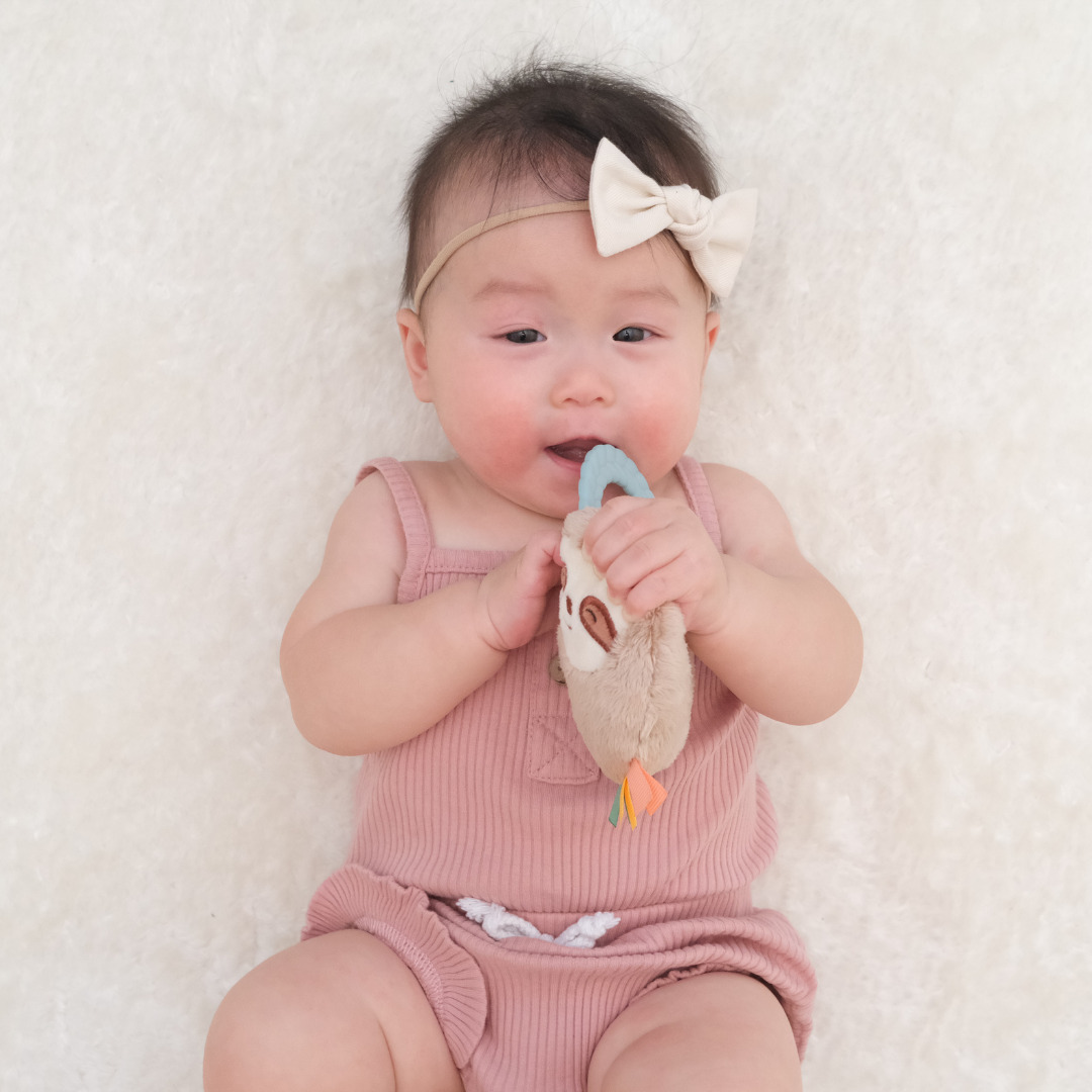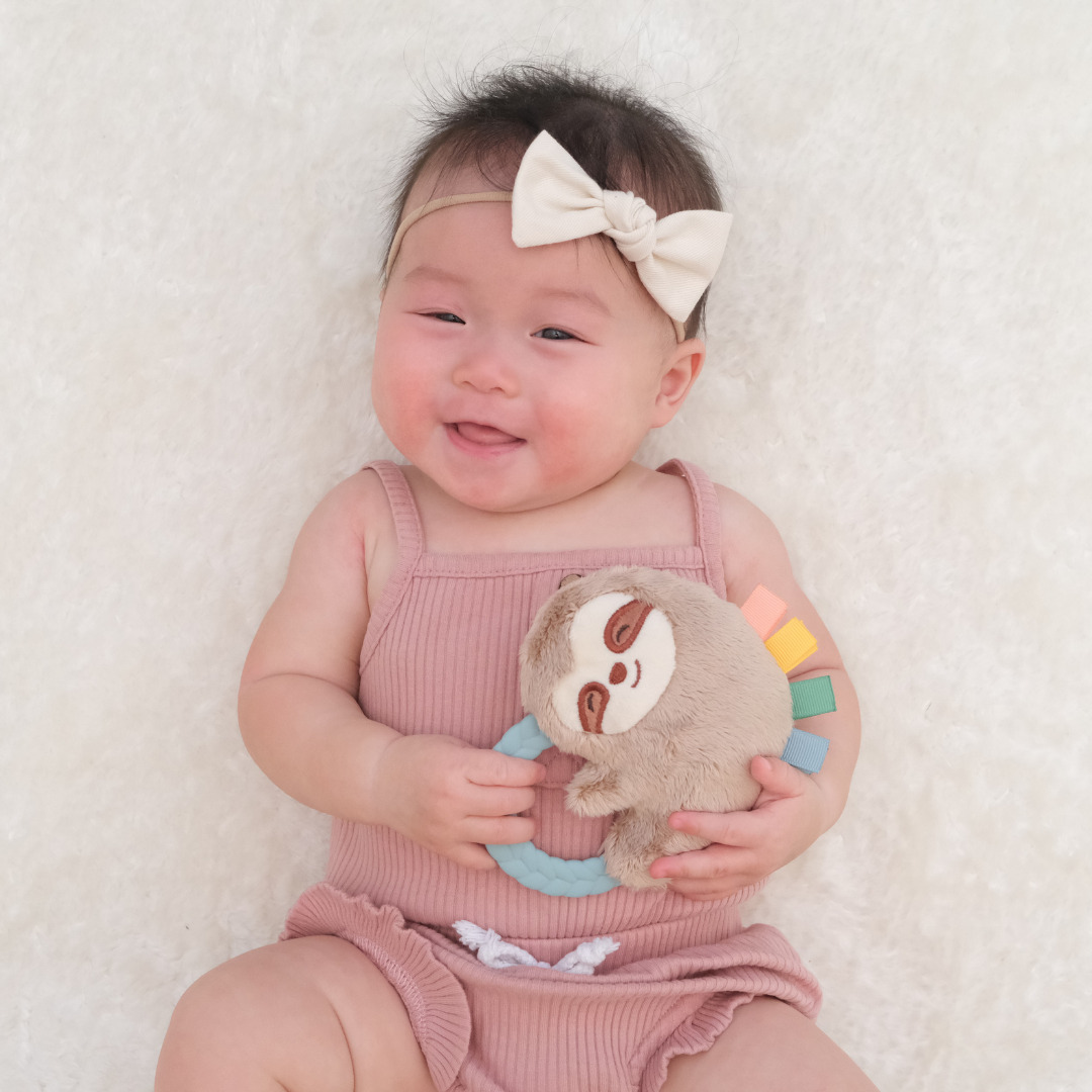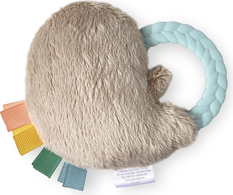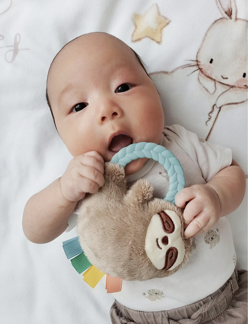 The Ritzy Rattle Pal™ is your babe's new bestie, doubling as a plush rattle and braided teething toy to soothe sore gums. With a gentle rattle sound and colorful textured ribbons, this playful baby rattle keeps your little one entertained and comforted. Whether in the stroller or car seat, the Ritzy Rattle Pal makes a perfect travel toy! Choose from a variety of stuffed animal characters, including a unicorn, dinosaur, sloth, and koala, or the adorable rainbow option.
