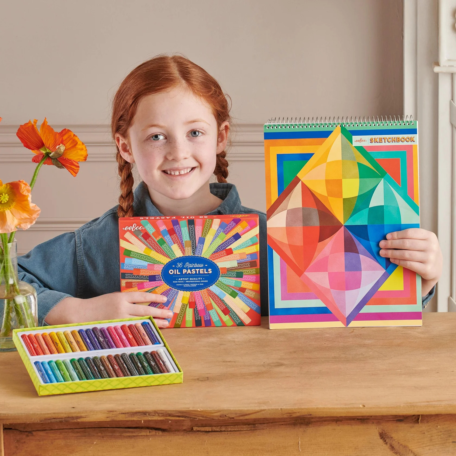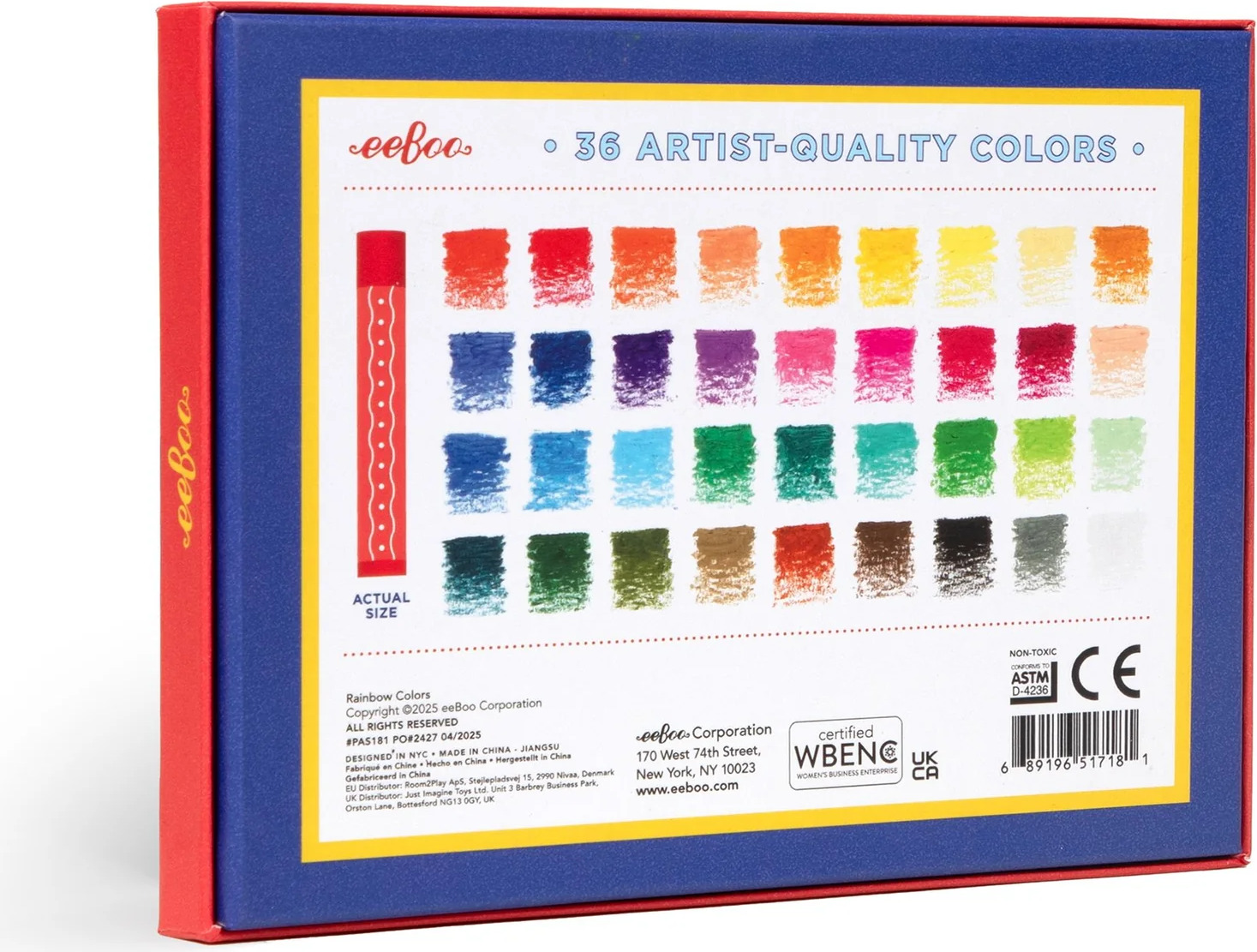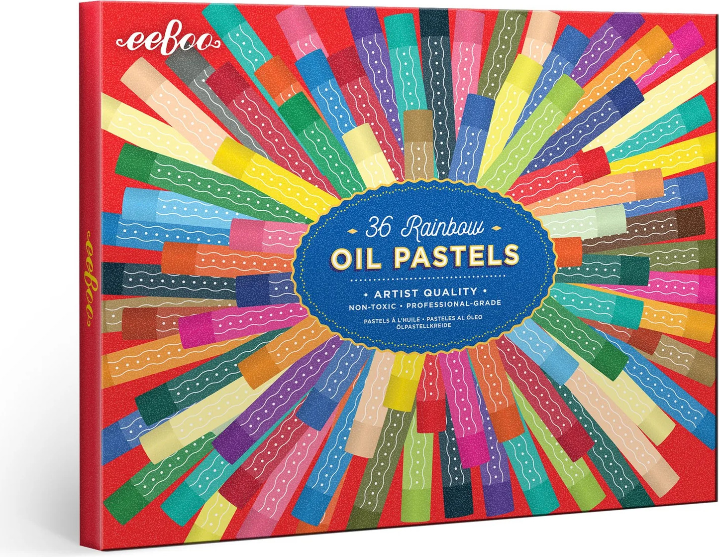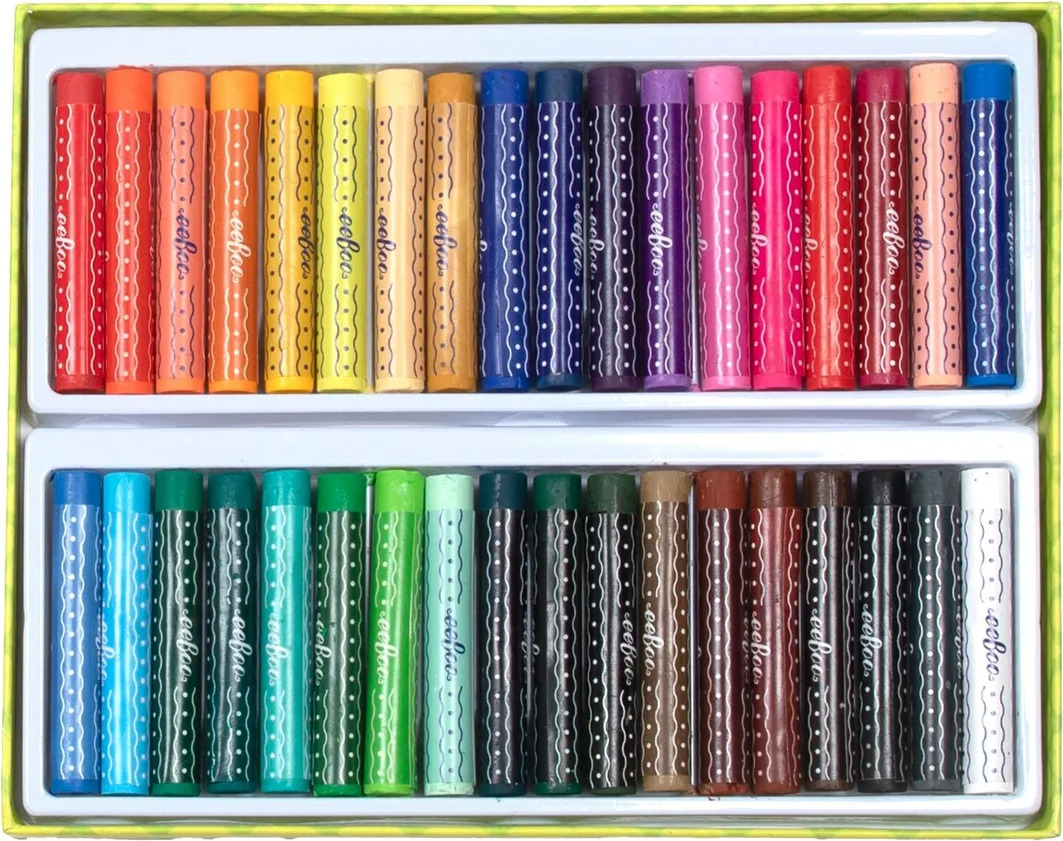 Artist-quality oil pastel sticks in a brilliant array of 36 fade-resistant, long-lasting colors. Packaged in a sturdy, sliding box featuring an explosion of color by our own eeBoo designers. Soft-touch feel and easy to blend, giving depth and subtlety to artwork on paper, canvas, or board. Pairs perfectly with eeBoo Rainbow Sketchbook.