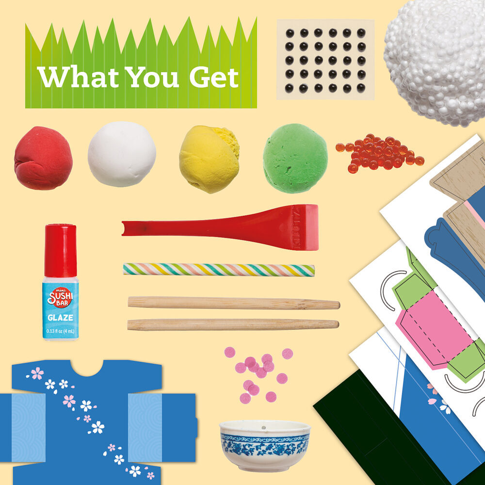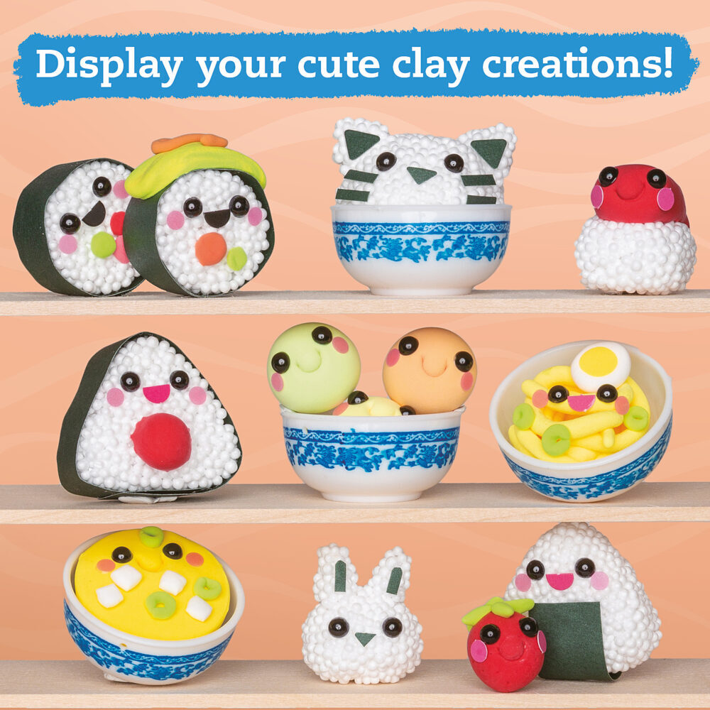 Make 16 cute sushi characters using clay and mixed media. Learn about the art of making sushi as you roll and sculpt adorable food with faces. Clay chefs will learn the difference between sushi rolls, onigiri (rice balls), sashimi, mochi, and other treats from Japan. Then, build out your sushi spread by packing a papercraft bento box, or a fancy dinner display. Complete the scene with meal-time extras, including an origami holder for your miniature chopsticks. Itadakimasu!