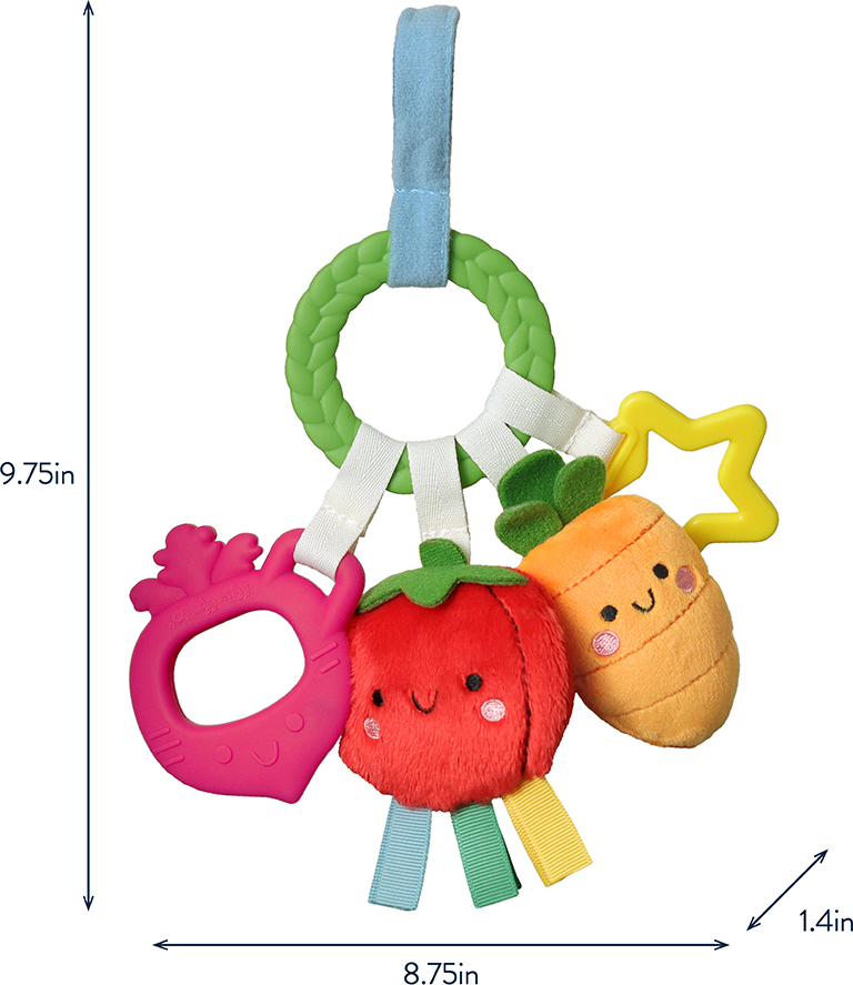 • Our signature braided teething ring is surrounded by adorable dangling toys with all different textures that keep baby busy on the go