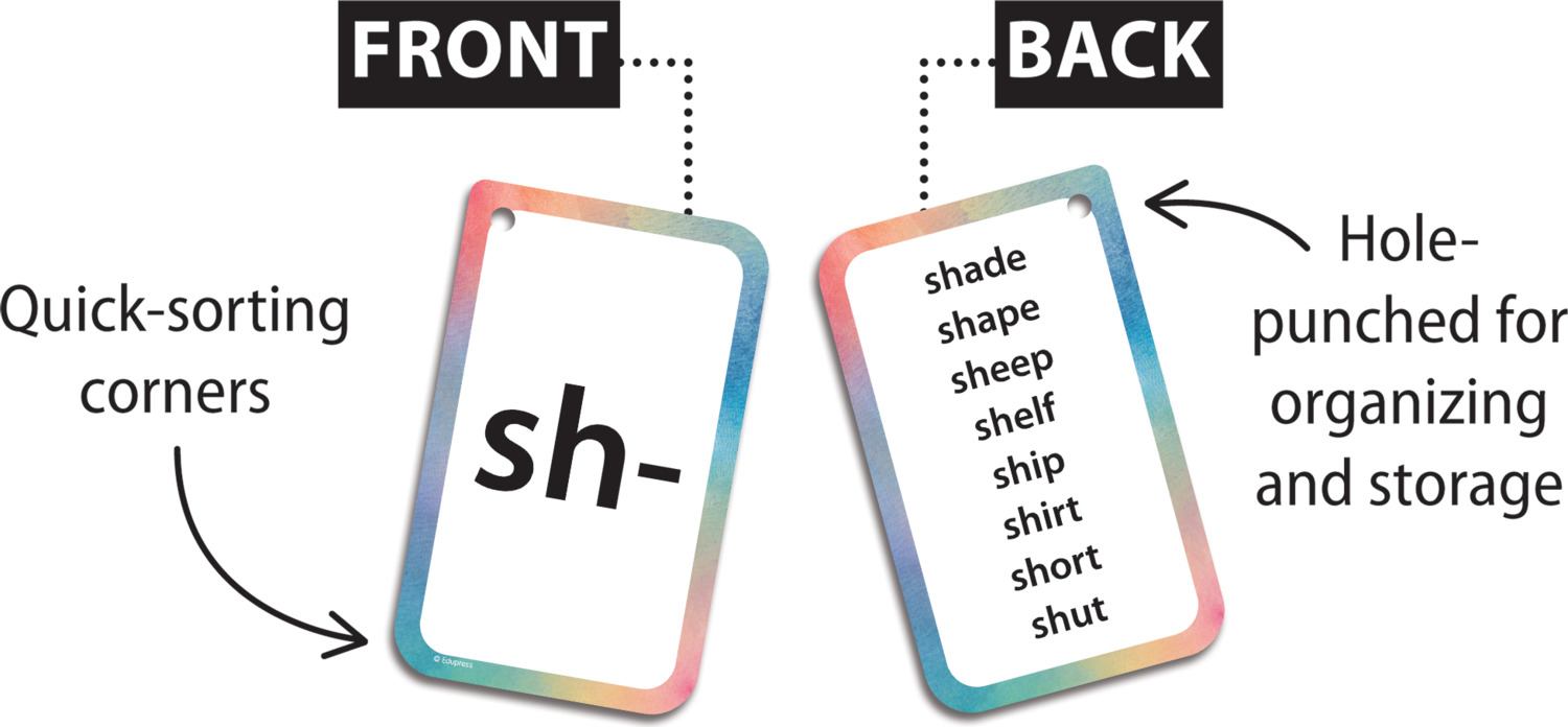Each flash card set contains a collection of full-color, high-interest student cards as well as instructions and tips for the teacher or parent, suggested activities, and additional blank cards. Each card has a hole in the top corner that can be fit with a ring or string to help with organization and storage. Additionally, each card has one corner that is shaped differently than the others. By lining up the non-rounded corners, the flash cards can quickly be faced in the same direction. When applicable, flash card sets include answers in small print on the reverse side of each card.