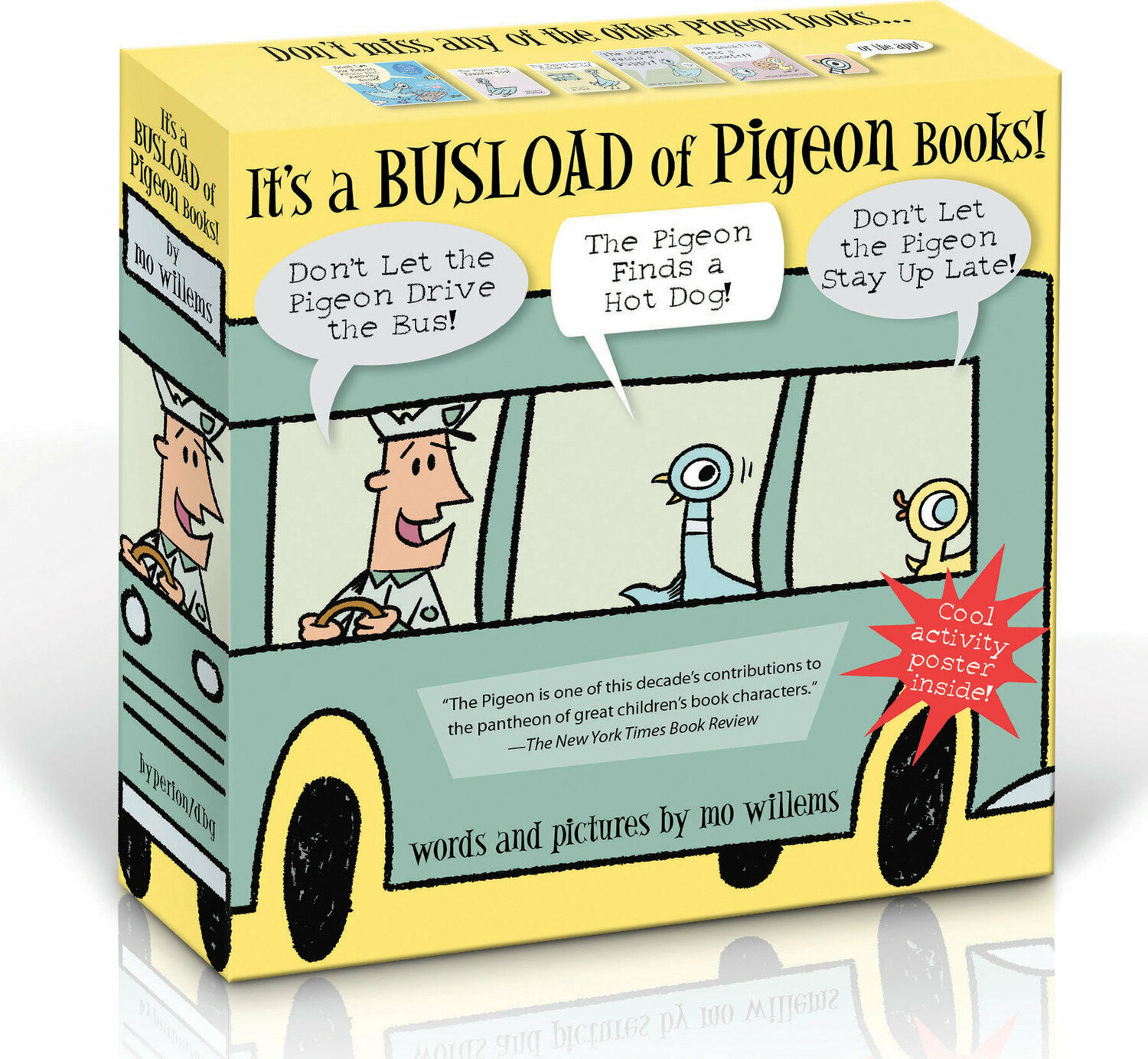 It’s a busload of the Pigeon books! Climb on board for three picture books starring the famous beleaguered bird- Don’t Let the Pigeon Drive the Bus!, The Pigeon Finds a Hot Dog!, and Don’t Let the Pigeon Stay Up Late!-by New York Times best-selling author/illustrator Mo Willems.