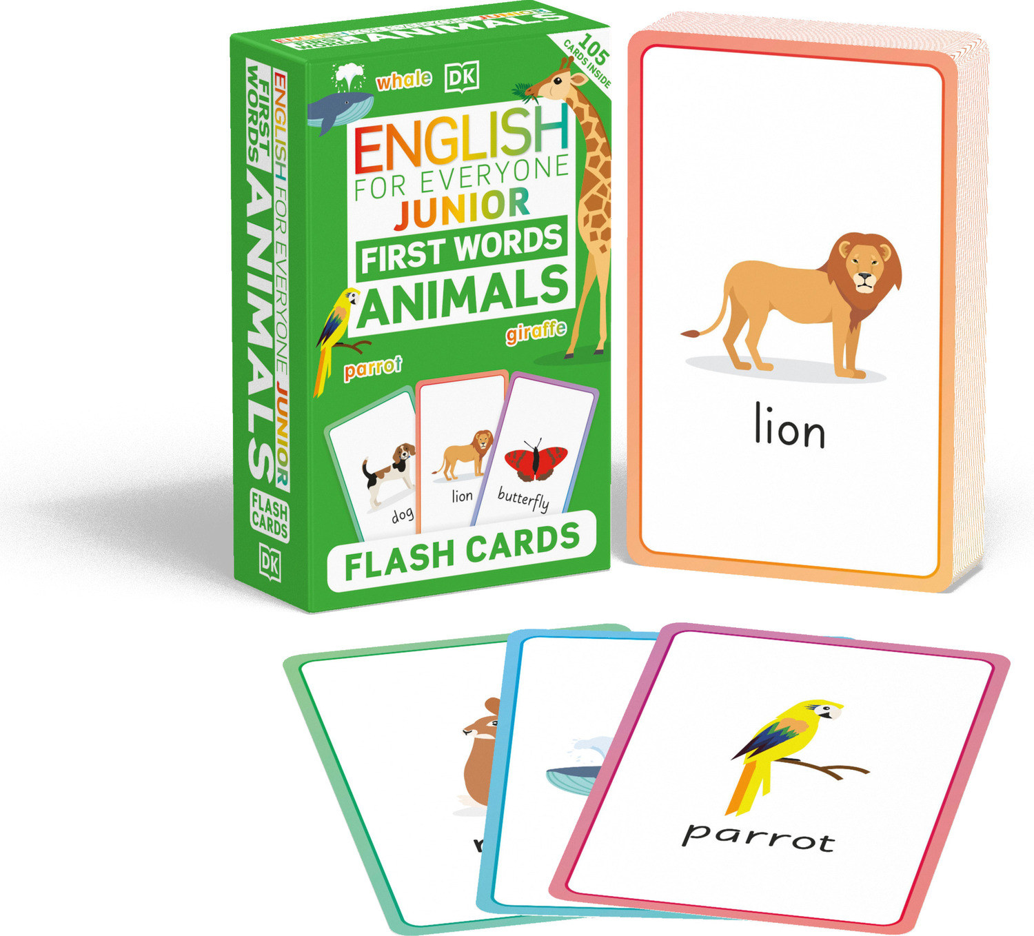 English for Everyone Junior First Words Animals Flash Cards have been designed for children who are starting to read and speak English. Each beautifully illustrated card features animage plus an essential animal word, and on the reverse of the card, just the image is shownso children can test their knowledge.