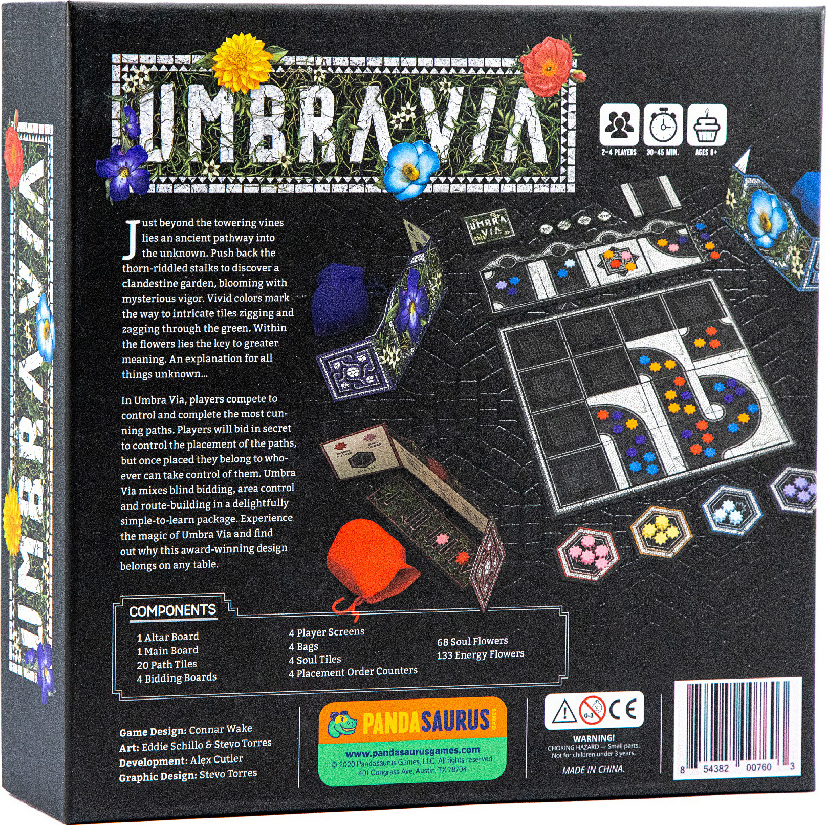 Just beyond the towering vines lies an ancient pathway into the unknown. Push back the thorn-riddled stocks to discover a clandestine garden, blooming with mysterious vigor. Vivid colors mark the way to intricate tiles zigging and zagging through the green. Within the flowers lies the key to greater meaning. An explanation for all things unknown... In Umbra Via, players compete to control and complete the most cunning paths. Reach into your bag to select wooden flowers, then place them on your secret board in the order of the paths you want most. But when players reveal their choices, things get delightfully tricky. Experience the magic of Umbra Via and find out why this award-winning design belongs on any table.