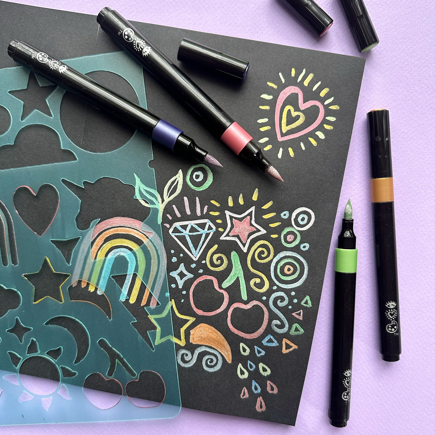 What's more satisfying than doodling with juicy markers? How about adding patterns and creating dramatic color-changing effects? Rainbows of creativity await! The marker box attaches with hook and loop onto the pad for on-the-go creativity. It includes 10 color-change markers, 2 activator markers, stencil and a 50-page art pad.