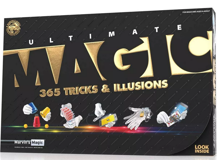 Marvin's Ultimate Magic Tricks and Illusions is our biggest and best box of tricks ever! This fantastic magic set contains the cups and balls trick, flash money trick, sponge balls, mind-reading tricks, fly paddles, a deck of miracle cards and Svengali cards, dice & canister trick, optical illusions and much, much more! Put on the ultimate magic show with this tremendous box full of easy to learn tricks & illusions.