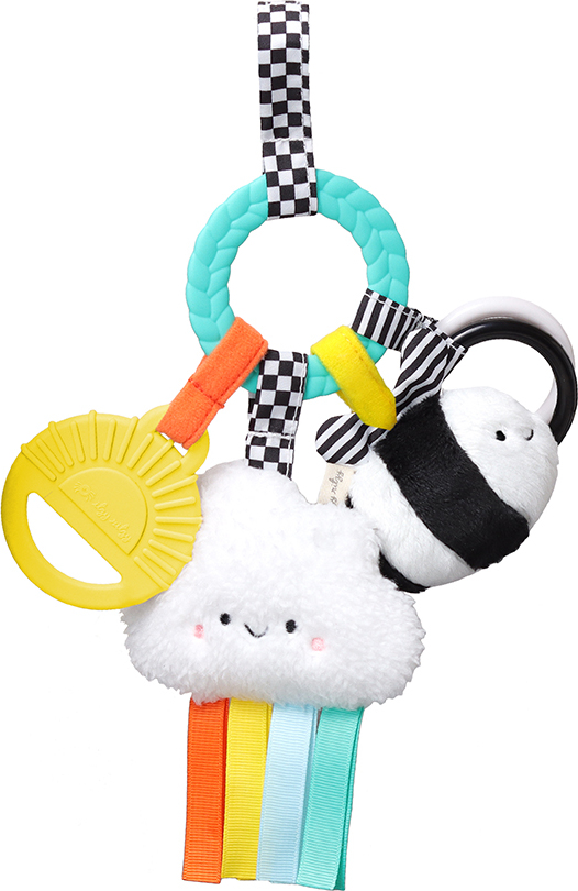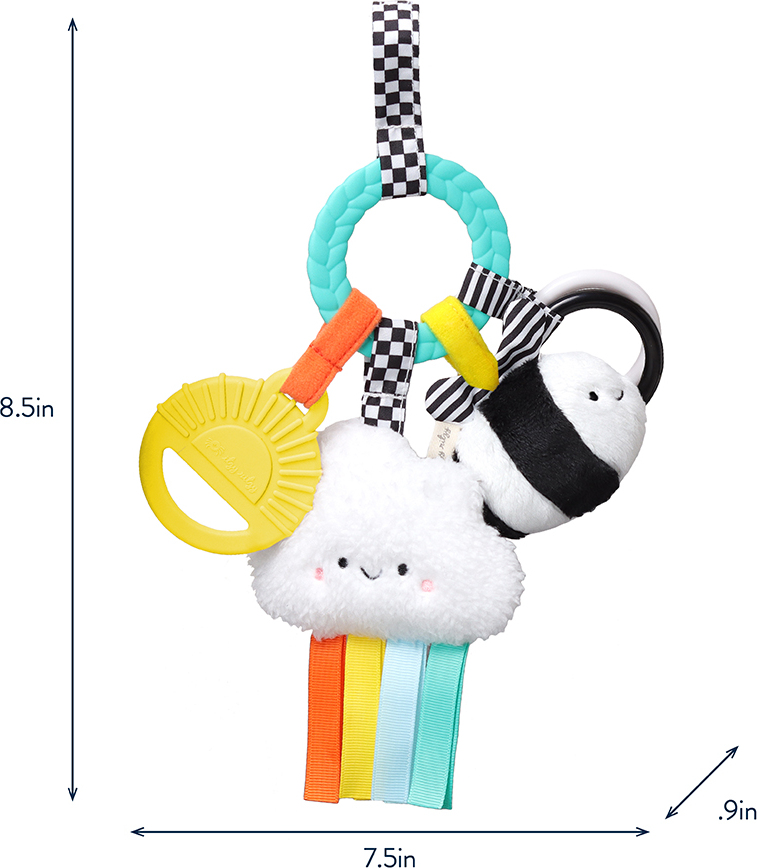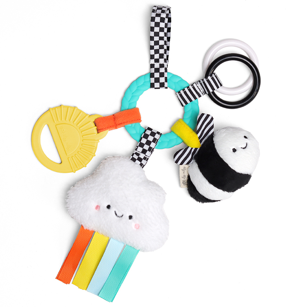 • Our signature braided teething ring is surrounded by adorable dangling toys with all different textures that keep baby busy on the go