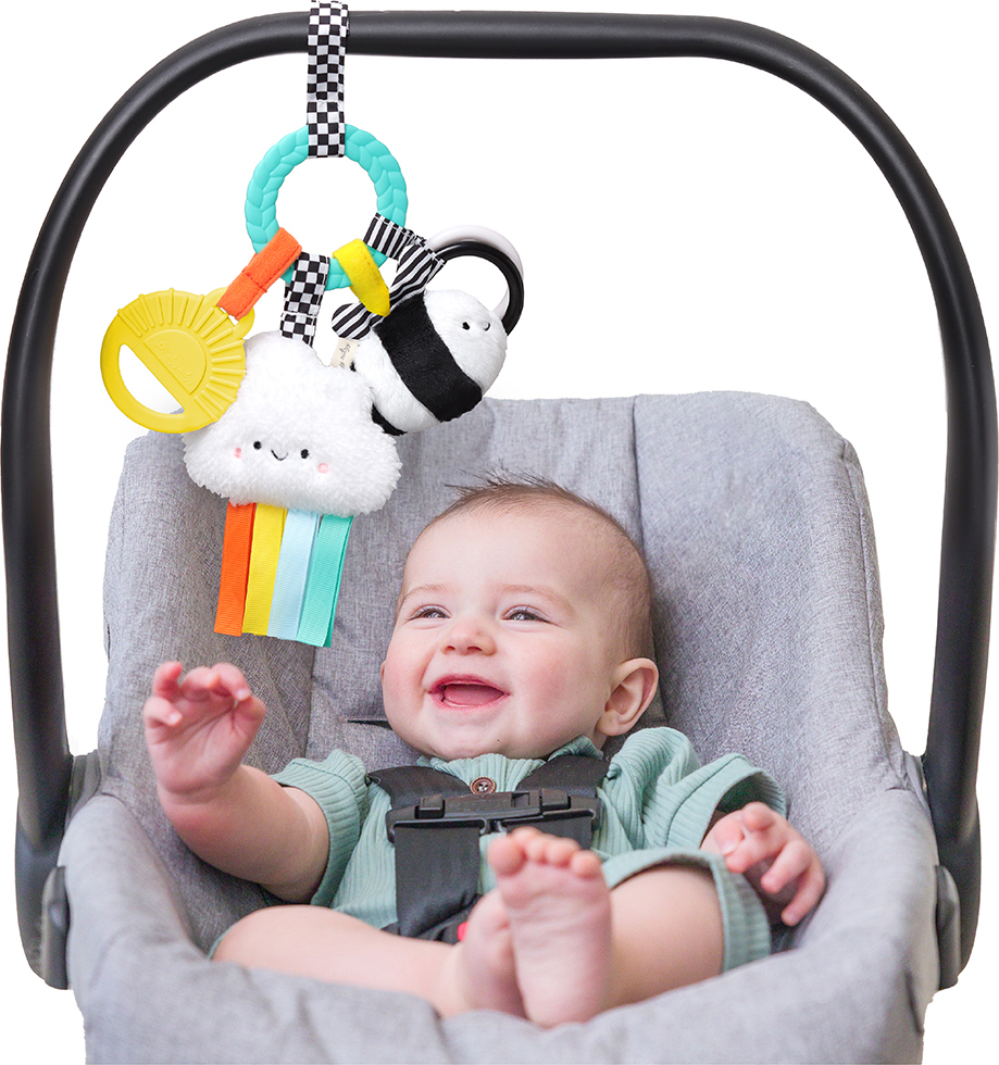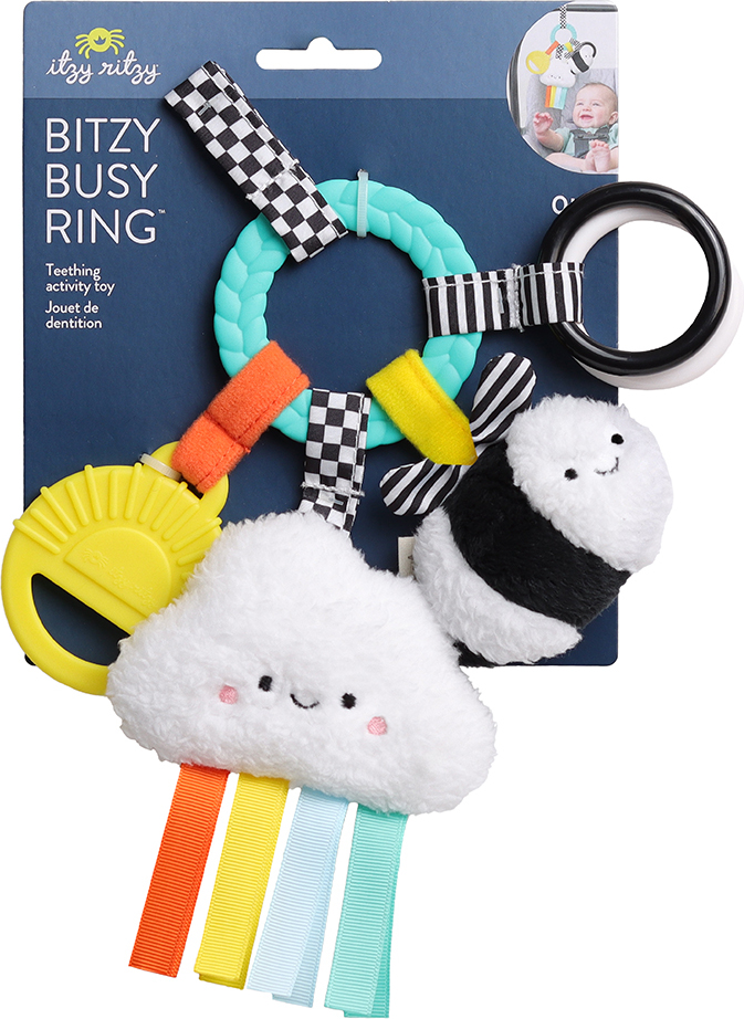 Teethe, Play & Explore! A sensory sensation, our Bitzy Busy Ring™ has all the love in the details with multiple features for baby to explore. Textured teethers and dangling toys that jingle, crinkle and delight – easily attach this toy to baby’s car seat or stroller for adventures ahead!