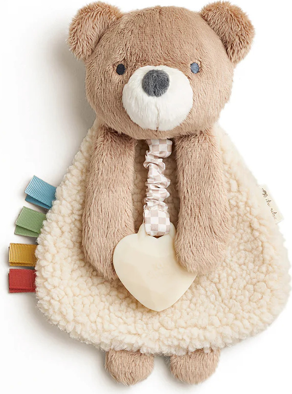 Our snuggly Itzy Friends Toy Collection Itzy Lovey™ features soft sherpa fabric and textured ribbons that baby will love to explore! A textured silicone teether helps massage and soothe sore gums, and crinkly arms and legs are sure to keep baby entertained with their gentle sound.