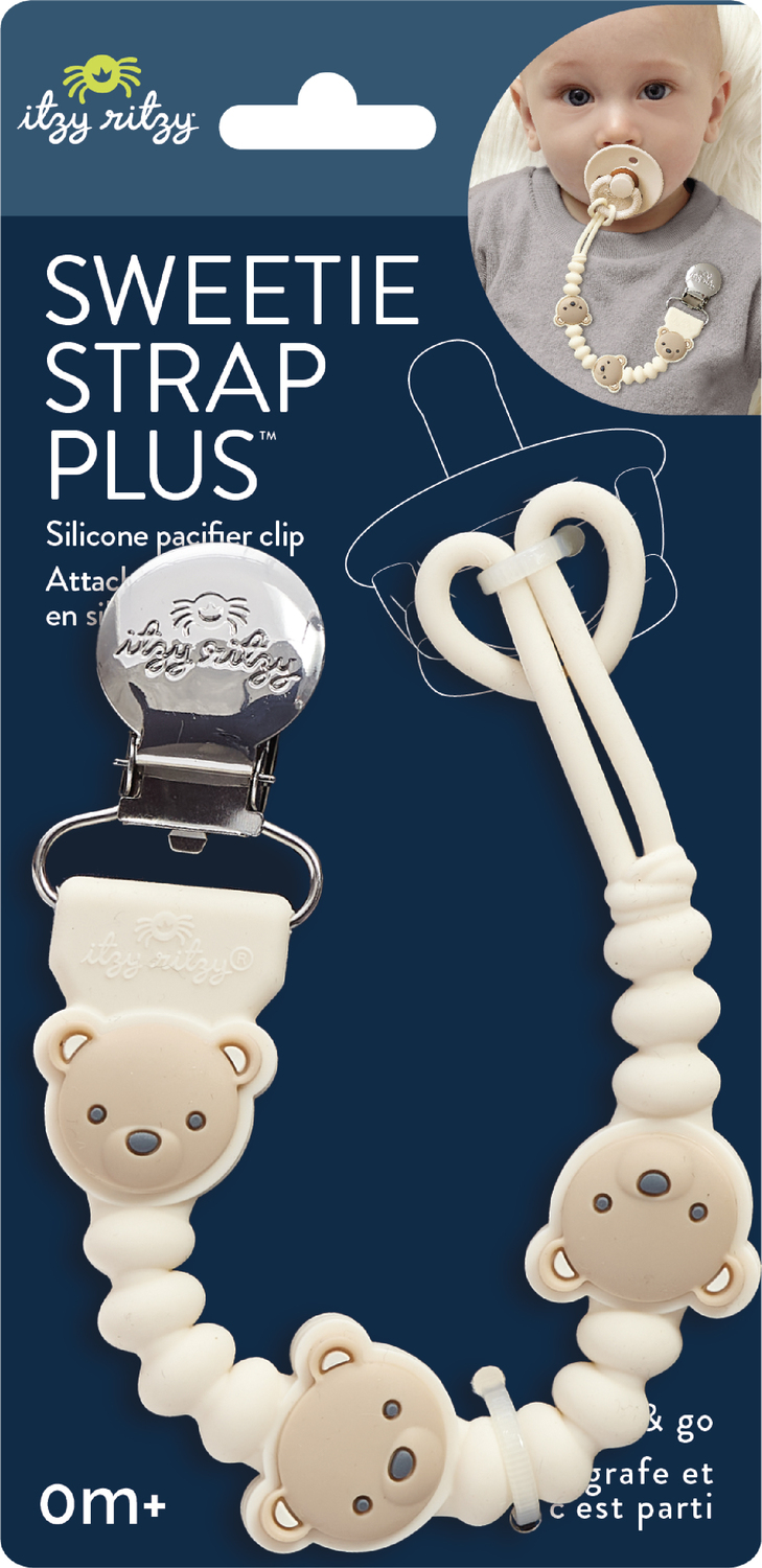 Holds paci close! Say goodbye to lost pacifiers! Our Sweetie Strap Plus™ is made of soft silicone and keeps pacifiers close while adding a sweet character to baby’s favorite pacifier.