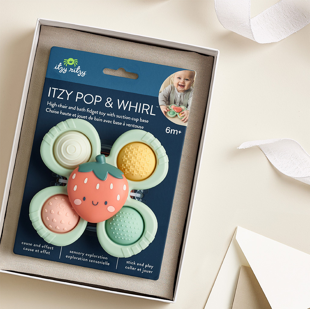 Put a new spin on sensory play with the Itzy Pop & Whirl™ fidget toy. Featuring a suction cup base, it sticks to tables, tubs and other smooth surfaces for sensory play at home and on the go. Four textured silicone poppers engage baby and help build fine motor skills.