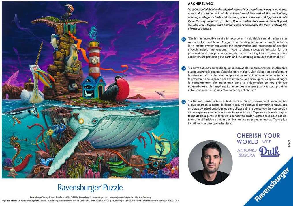 Our “Archipelago” puzzle highlights the plight of some of the ocean’s most unique creatures! An incredibly rare albino humpback whale is being transformed into part of the archipelago, creating a place of refuge for all the birds and marine species. The souls of lost animals fly in the sky. Part of our “Cherish Your World” series, the artist Dulk includes small targets in his surreal works to emphasize the fragility of, and threat to, nature with hope of inspiring us to protect our planet!
