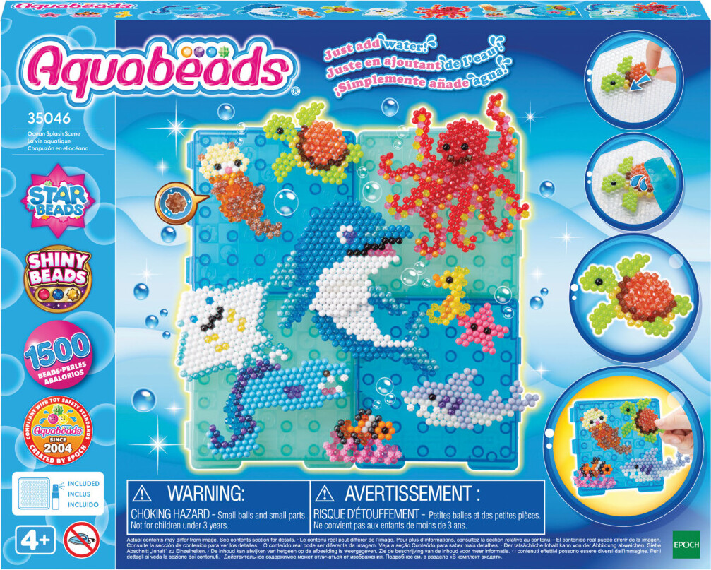 Aquabeads is the Original Water-Activated Bead Craft Kit! Since 2004, children throughout the world have created millions of Aquabeads designs. The Ocean Splash Scene set comes with over 1500 solid, jewel, polygon and star beads in 29 colors, layout tray, sprayer, creation display, design pegs, template sheet, and instructions. Following the template sheet, place the beads onto the tray to create your design.